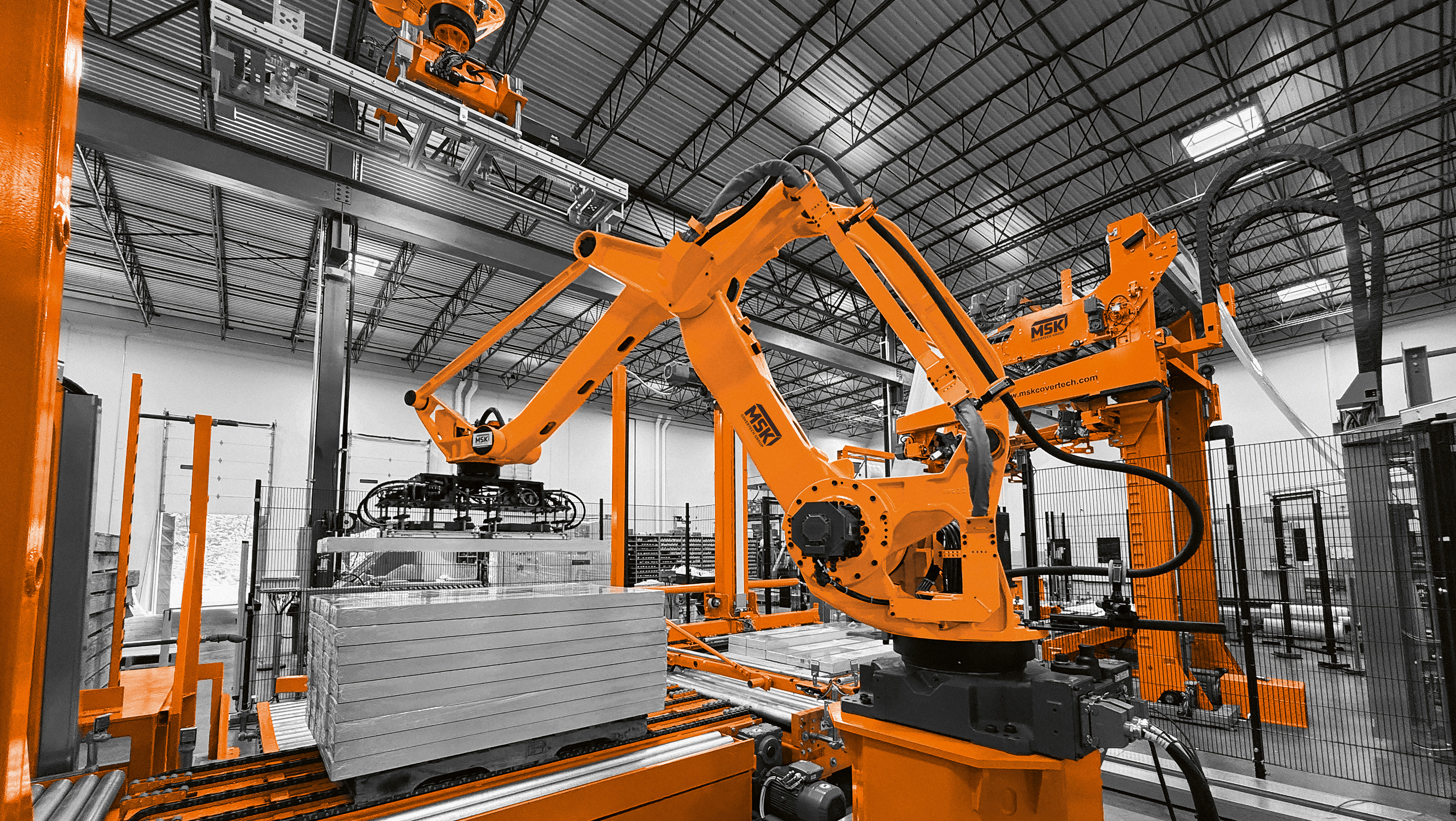 MSK Roboterpalettierer sind Multitalente, welche auf engstem Raum operieren. In Kombination mit individuellen End-of-arm-Tools kommen sie für Produkte unterschiedlichster Branchen zum Einsatz. Alles gesteuert und protokolliert durch unsere Software MSK EMSY. MSK Systeme bieten gegenüber anderen Anbietern den Vorteil, dass sowohl die Roboterzelle mit individuellen End-of-Arm-Tools, periphere Geräte wie das Auflegen von Boden-/Zwischenlagen, Fördertechnik und Verpackungsanlage selbst aus einer Hand konstruiert, produziert, montiert und geliefert werden. Auch die Zuführung einzelner Packstücke zur Palettierstation gehört zum MSK Portfolio. Da MSK alle Komponenten selbst konstruiert und fertigt, sind die Systeme auf Basis des MSK Baukastenprinzips individuell konfigurierbar und dennoch standardisiert.